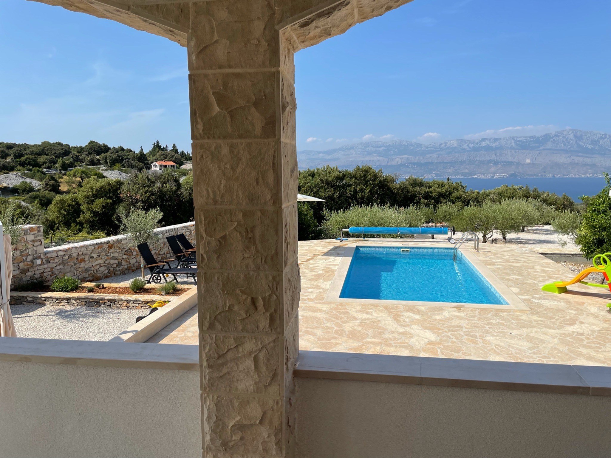 Der sonnenüberflutete Poolbereich ist über die Terrasse nur wenige Schritte entfernt, während ihr einen grandiosen Ausblick auf die Adria und die Gebirgskette genießt. Ein besonderes Highlight ist das abendliche Lichterspiel zwischen Split und Omiš.