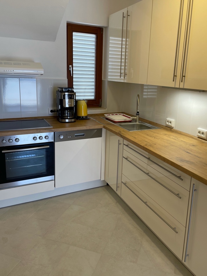Die Küche ist neu, modern, praktisch und geräumig eingerichtet. Sie ist ausgestattet mit einem Herd, einem Backoffen, einer Spülmaschine, einer Mikrowelle sowie mit üblichen Küchenutensilien. Ein großer Kühlschrank befindet sich in der angeschlossenen Speisekammer. Eine Kaffemaschiene, ein Mixer, ein Eierkocher und ein Toaster sind natürlich auch dabei. Das entspannte Kochen kann beginnen.
